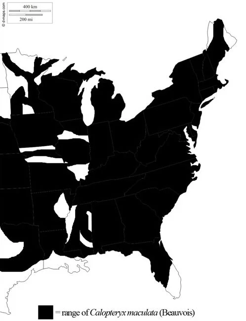 Damselflies, like our beloved ebony jewelwing, are distinguished from their larger dragonfly cousins by their size and delicate, vertically-folding wings. Females are distinguished from males by a white dot on the tip of each wing. The geographic range of the ebony jewelwing stretches from Florida to Maine, and westward to Texas. The distribution of the ebony jewelwing overlaps largely with the Misiziibi (mis - i - zee - bi; '“giant river” in Ojibwe; origin of name “Mississippi River”) and her tributaries - the geographic range of flora, fauna, and fungi centered in our natural heritage, folk medicine, and wildcrafting.